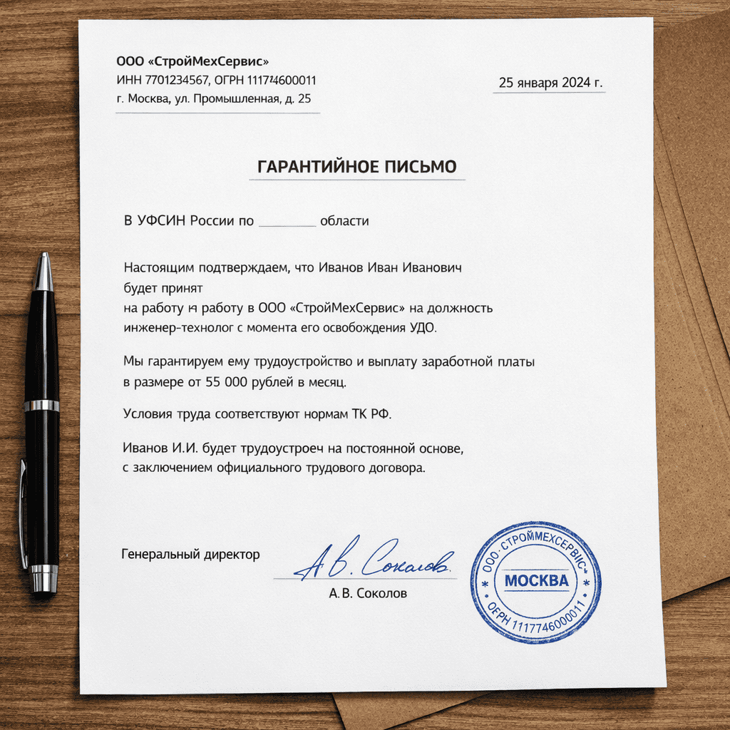У нас можно купить гарантийное письмо от ИП, ООО, родственников законно. Срок выполнения – один день. Данные с подтверждением и гарантией. Настоящие реквизиты, подписи, мокрые круглые печати. Купить гарантийное письмо о трудоустройство для УДО, ИТР можно, оставив заявку на нашем сайте, или позвонив по номеру +7 (499) 213-05-59. Доставка документов по Москве и другим регионам РФ. Конфиденциальность и своевременное выполнение гарантируем. Мы знаем, какие документы нужны осужденному для досрочного освобождение, и за небольшую цену готовы все сделать. Свяжитесь с нами, и наш консультант расскажет, как получить гарантийное письмо, как его правильно оформить, и как сделать заказ, чтобы получить его уже на следующий день. Не упускайте уникальную возможность получить УДО без бюрократической волокиты.